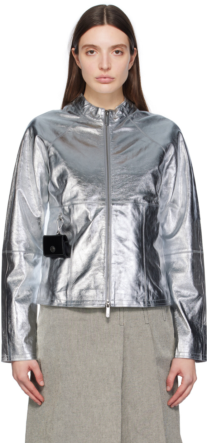 Серебряная кожаная куртка Daria. Куртка из зернистой кожи ягненка, сертифицированная LWG. Съемный чехол для наушников AirPods Pro из полированной телячьей кожи спереди.Конструкция со вставкамиВоротник-стойкаДвусторонняя молнияКарманы в швахРукава регланНакладной карман внутриБрелок и шнурок -застежка внутриПодкладка из вискозного атласа с выгравированным логотипом.Серебристая фурнитура с выгравированным логотипом. Цвет поставщика: серебристый. Основная часть: 100 % кожа ягненка. Отделка: 100% телячья кожа. Подкладка: 100% вискоза. Сделано в Индии.