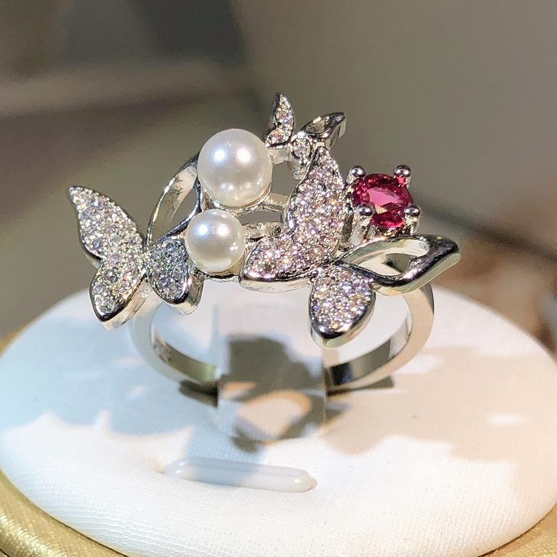 Серебряное Элегантное Двойное Жемчужное Двойное Кольцо с Полным Цирконом в Форме Бабочки Ювелирное Изделие Женское Кольцо с Цирконом для Милой Девушки Вечеринка по Случаю Дня Рождения 6