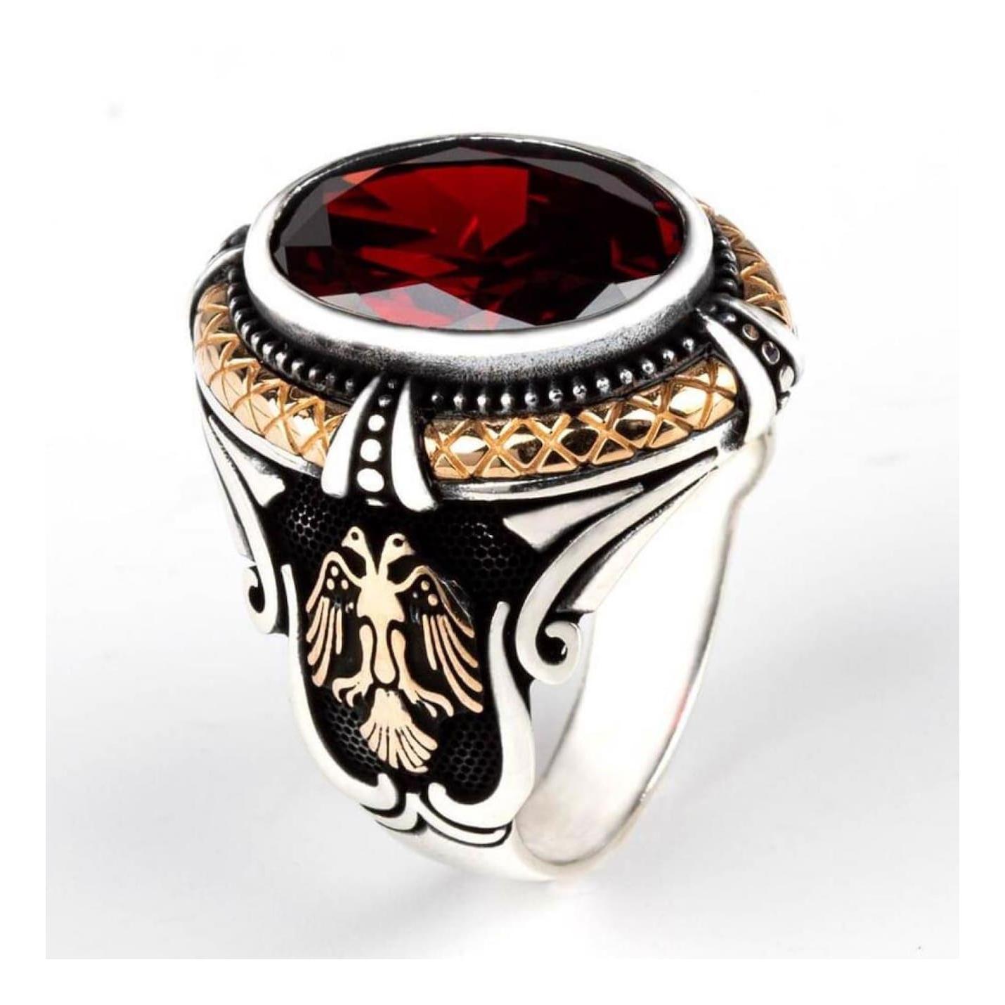 ? Красный цветок: Серебряное кольцо с двуглавым орлом и красным цирконием Изготовлен из серебра 925 пробы. Это примерно 17 ± г. Размеры верха кольца 2 х 1,4 ± см. На кольце красный циркон. Рядом с кольцом изображен двуглавый орел. Вы можете бесплатно узнать свой размер кольца у ювелира. Возврат/обмен персонализированных товаров невозможен.