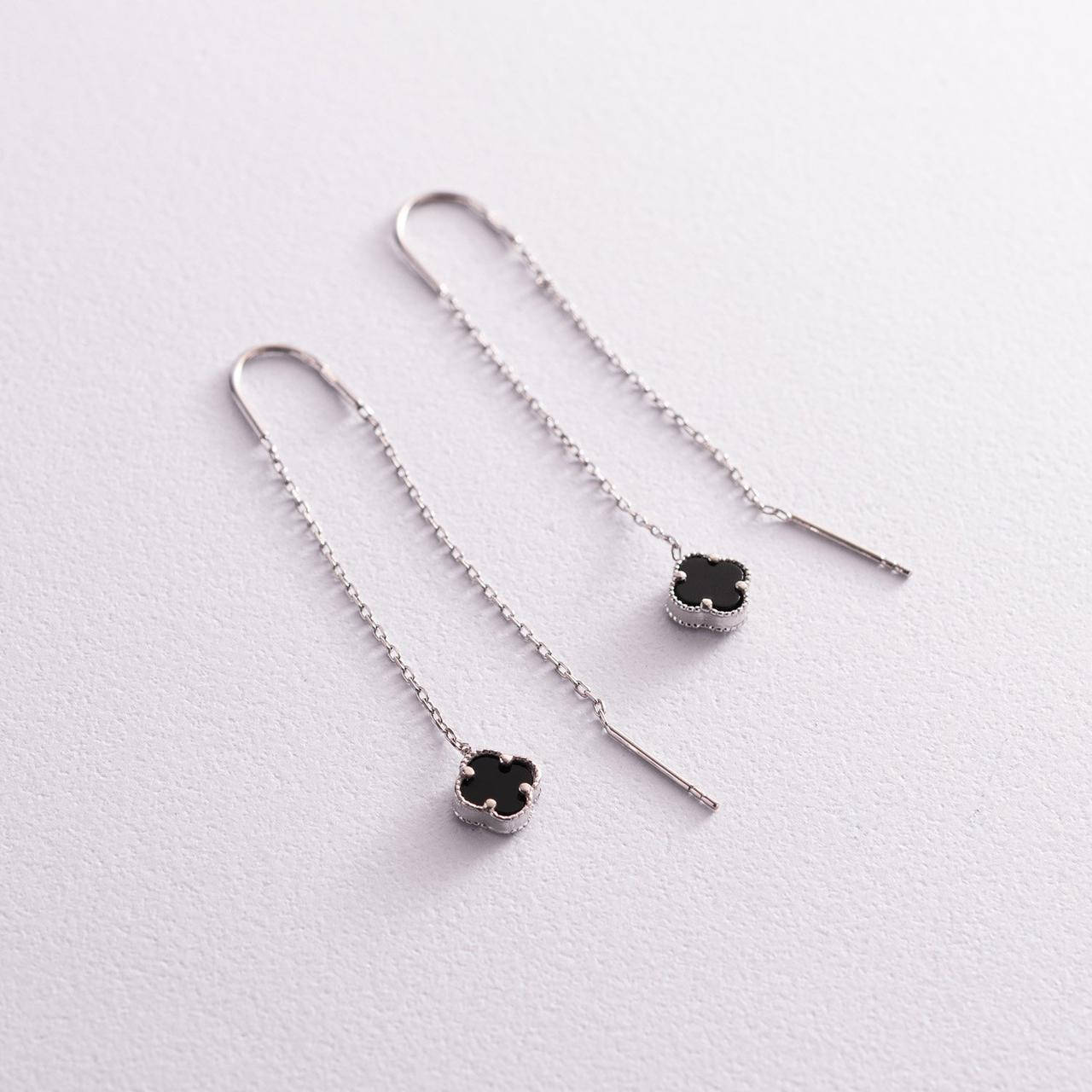 Серебряные серьги - протяжки Клевер с ониксом 123173 Оникс 1.40 г Черный