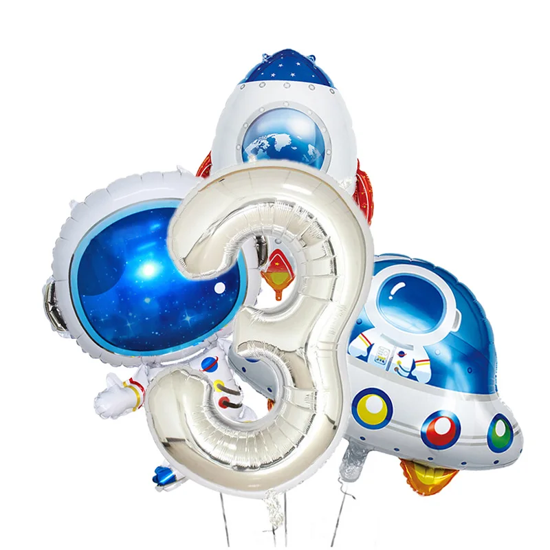 Серебряные фольгированные шары с космонавтом, ракетой и дирижаблем, 32 дюймов