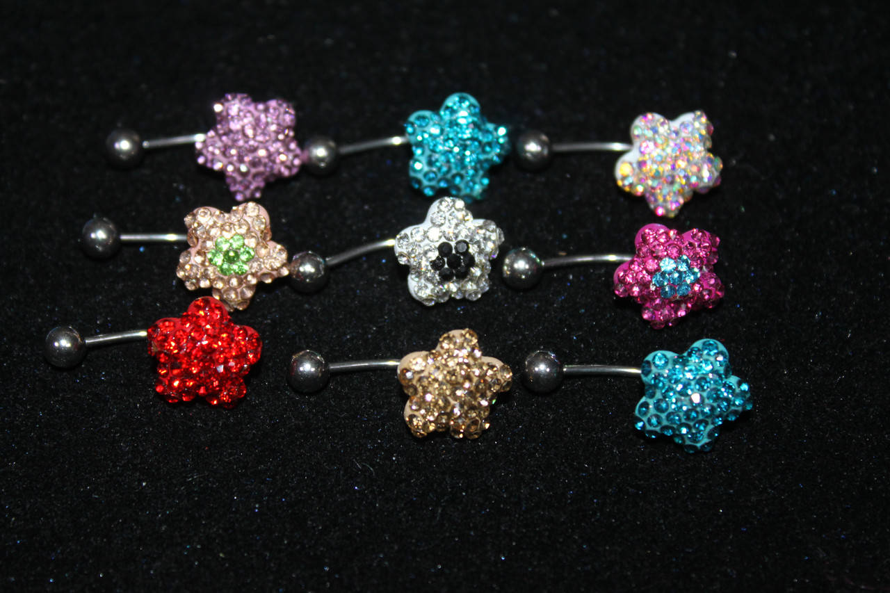 Сережка серебристая для пирсинга пупка цветочек с камнями 1 шт. Сережка для пирсинга - гипоаллергенная, изготовлена из стали. Вставки: камни. Цвета - красный, бежевый, голубой, белый, сиреневый. Пирсинг пупка зрительно изменяет фигуру и притягивает взгляды. Подтянутый животик, украшенный камушками, выглядит очень эстетично.