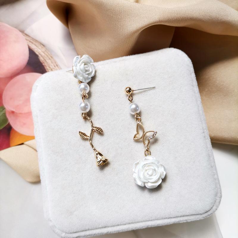 Серьги-гвоздики с белой розой, асимметричные серьги-бабочки, новые креативные серьги, подарок для девочек белый