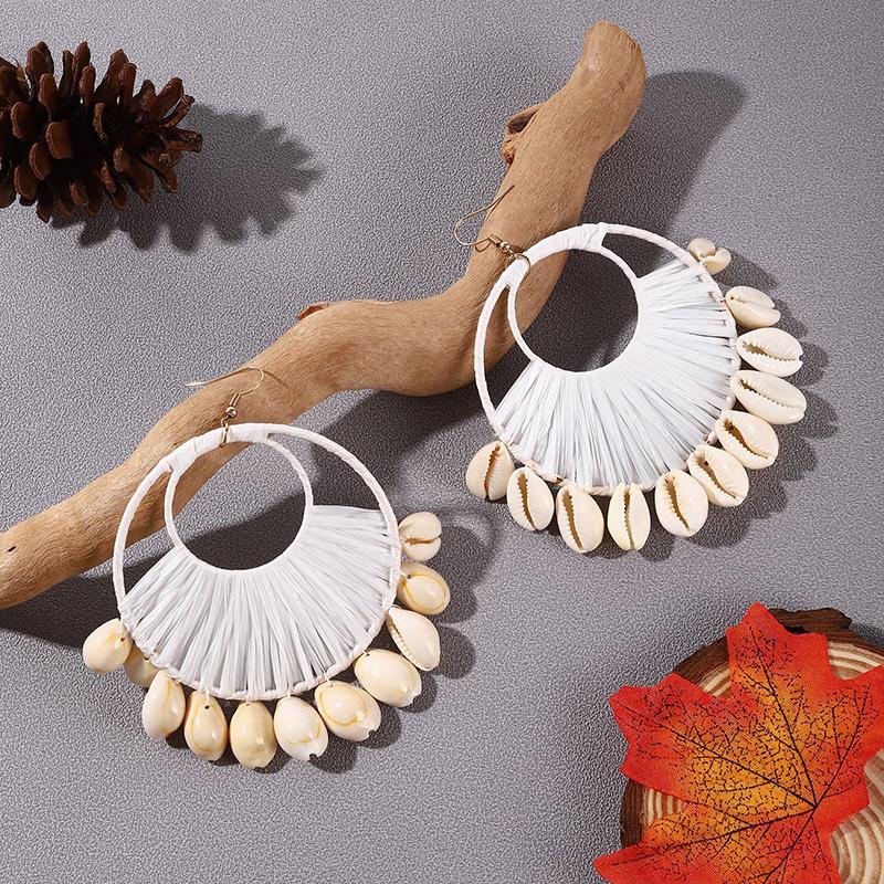 Серьги из ракушек ручной работы из рафии, крупные, круглые, с фестончатыми краями, в пляжном курортном стиле