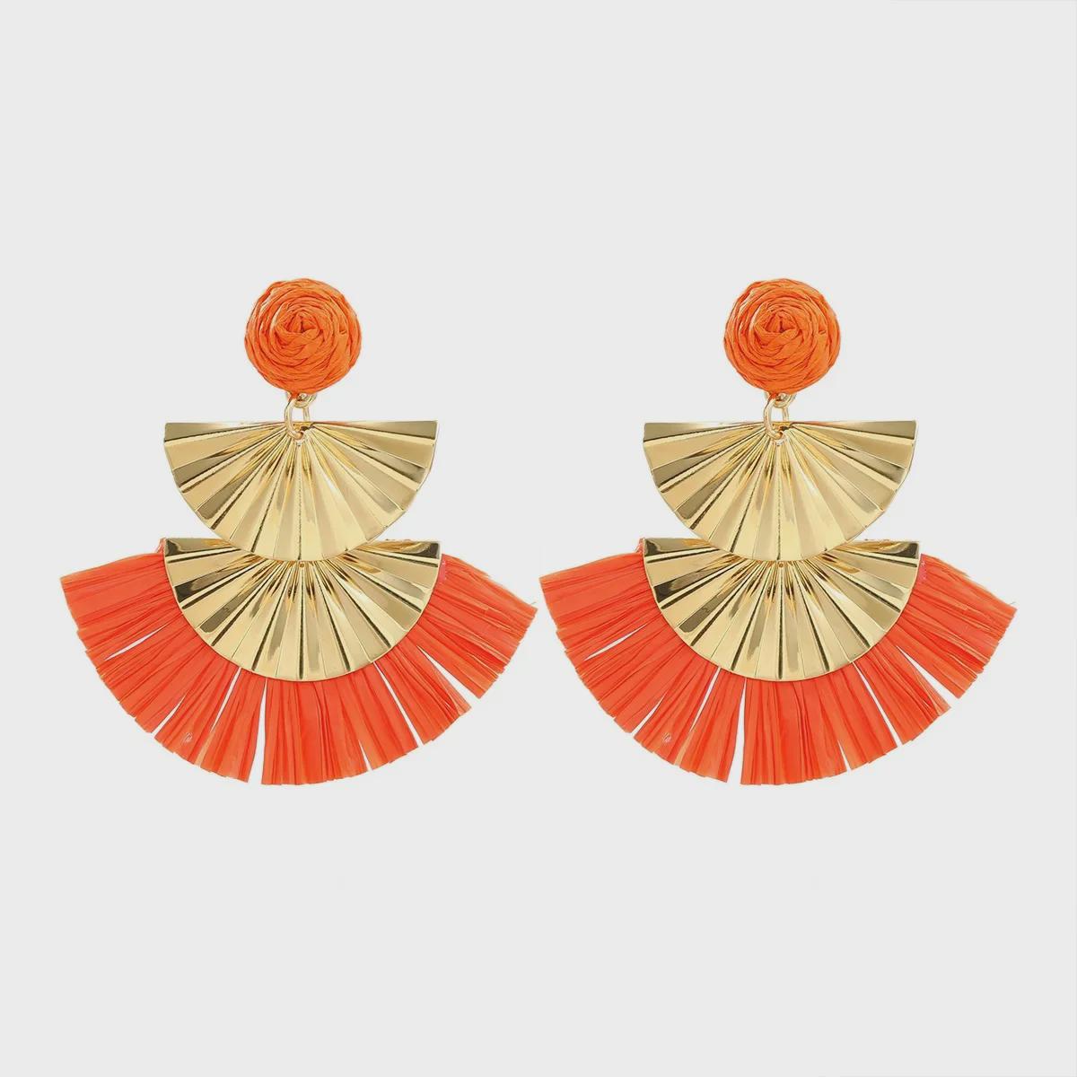 Серьги из рафии в форме веера в европейско-американском стиле в стиле ретро с металлическими листьями - аксессуары для волос ручной работы оранжевый