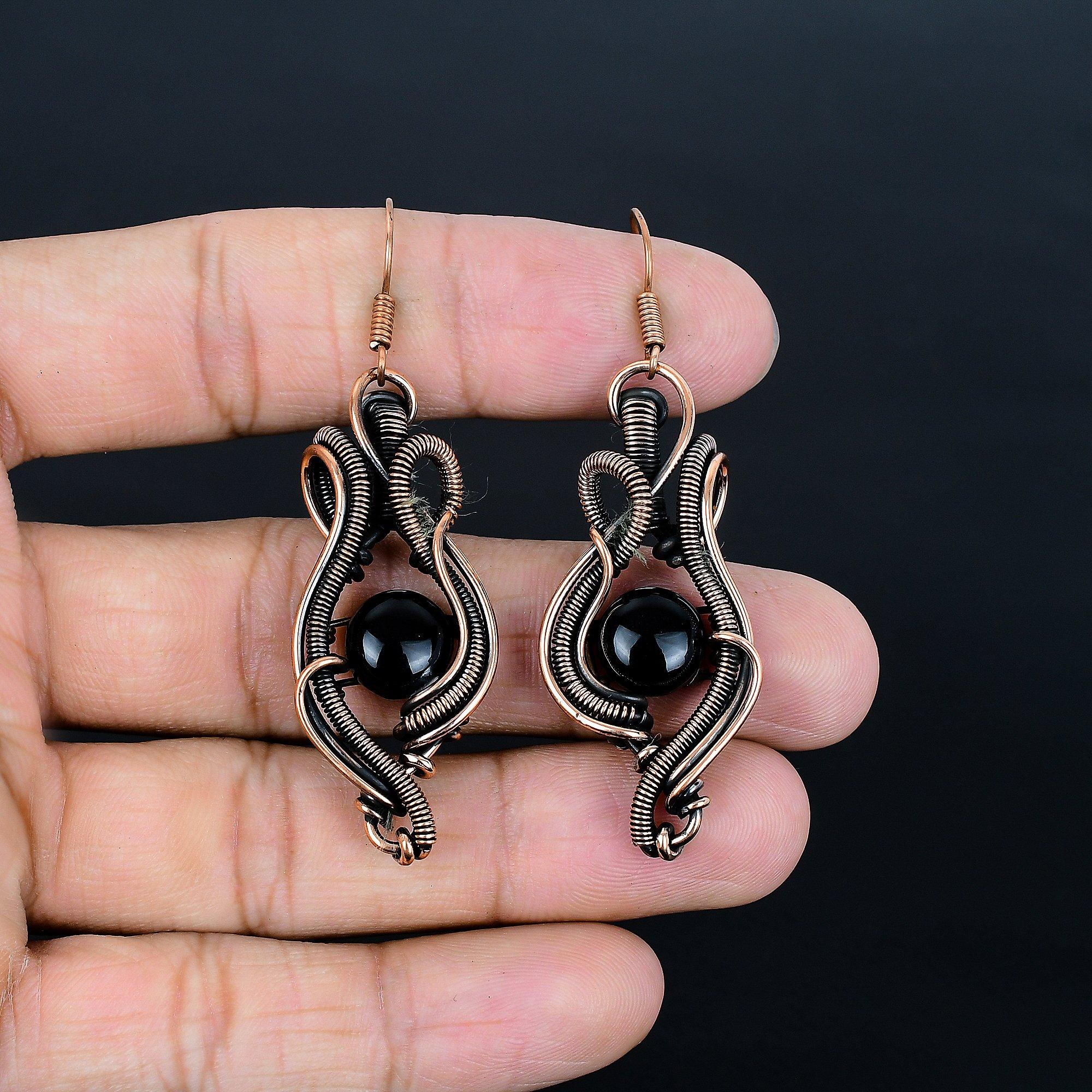 Серьги из черного оникса, обернутые медной проволокой 999 пробы, серьги ручной работы с драгоценными камнями ко Дню памяти 2.48 Inches чёрный