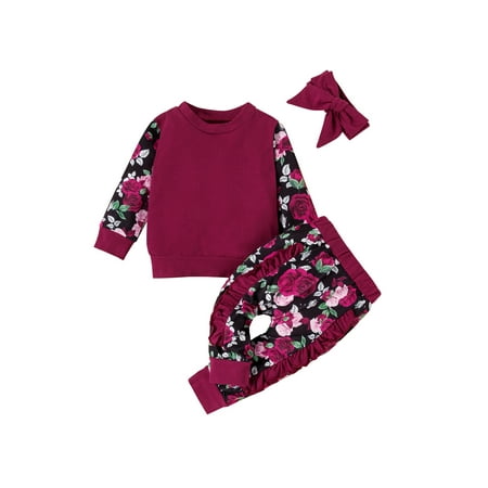 IZhansean 3PCS Baby Girls Clothes Floral Ruffle Long Sleeve Tops+Pants Headband Infant Autumn Spring Outfits Wine Red 0-6 Months