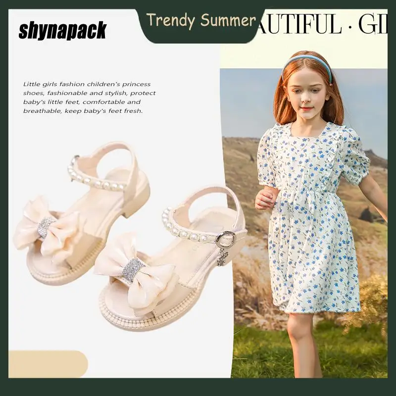 2022 Summer New Children's Sandals Girls Rhinestone Pearl Bow Soft Bottom Shoes Open Toe Non-Slip Princess Baby Girl Shoes