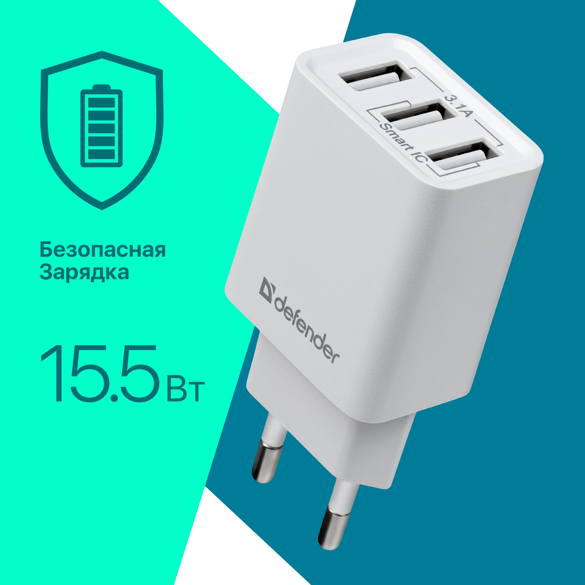 Сетевое зарядное устройство для телефона 3 USB Defender UPA-31, зарядка для телефона 5V/3.1 А, белый