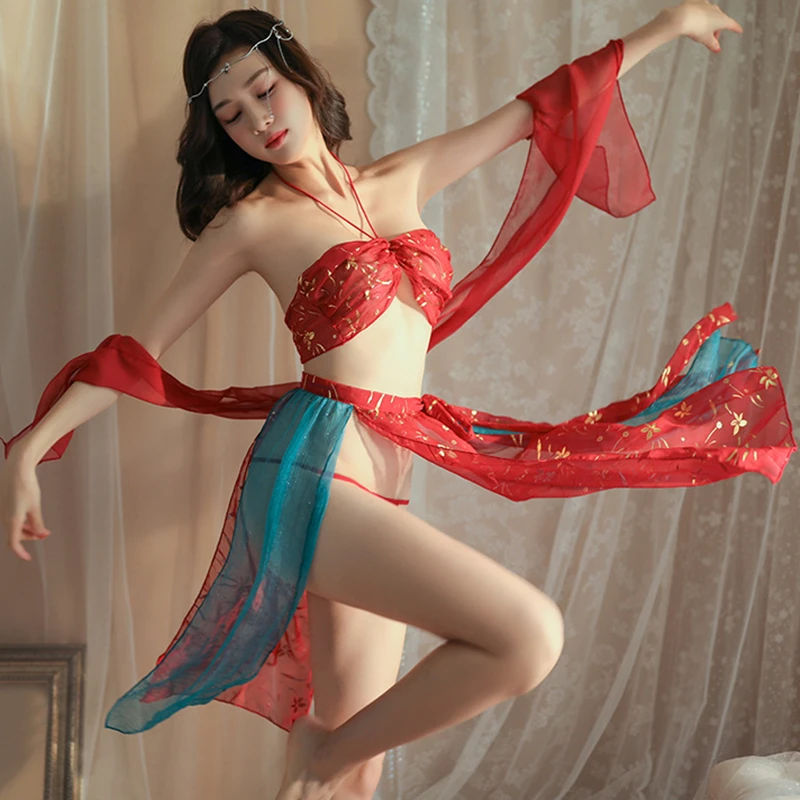 Сетчатое китайское традиционное платье, женские Экзотические костюмы, женское белье Fervour, сексуальная юбка ханьфу с лямкой на шее, Соблазнительный комплект из прозрачной шели