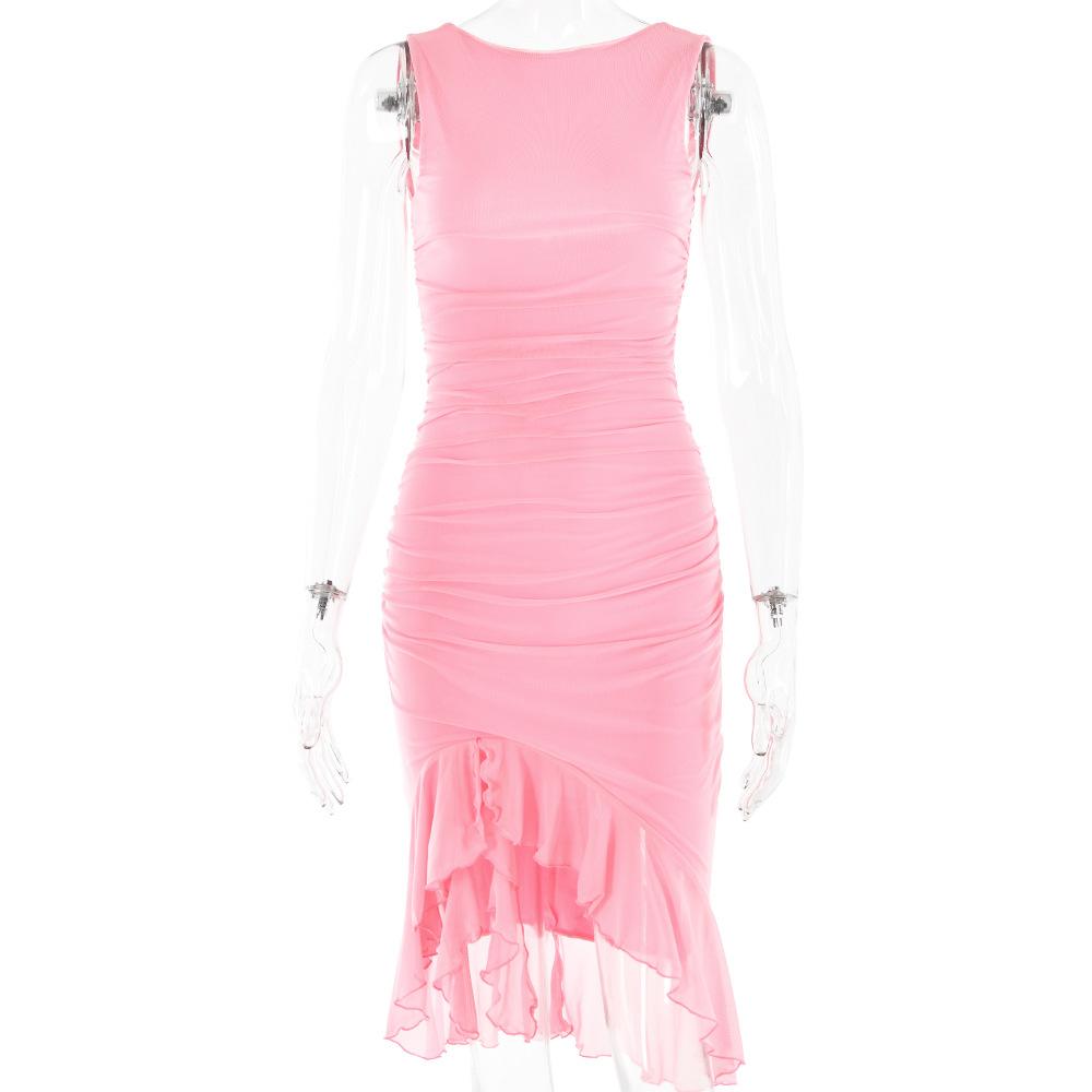 Сетчатое облегающее платье с рюшами на подоле и открытой спиной, сексуальное однотонное облегающее платье с рюшами, новинка 2024 года S розовый