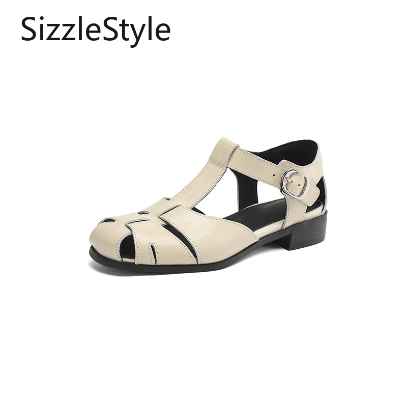 Women Handmade Genuine Leather Roman Sandals Round Toe T-Bar Strap 2.5cm Chunky Heel Textured Flexible Sole Black Beige