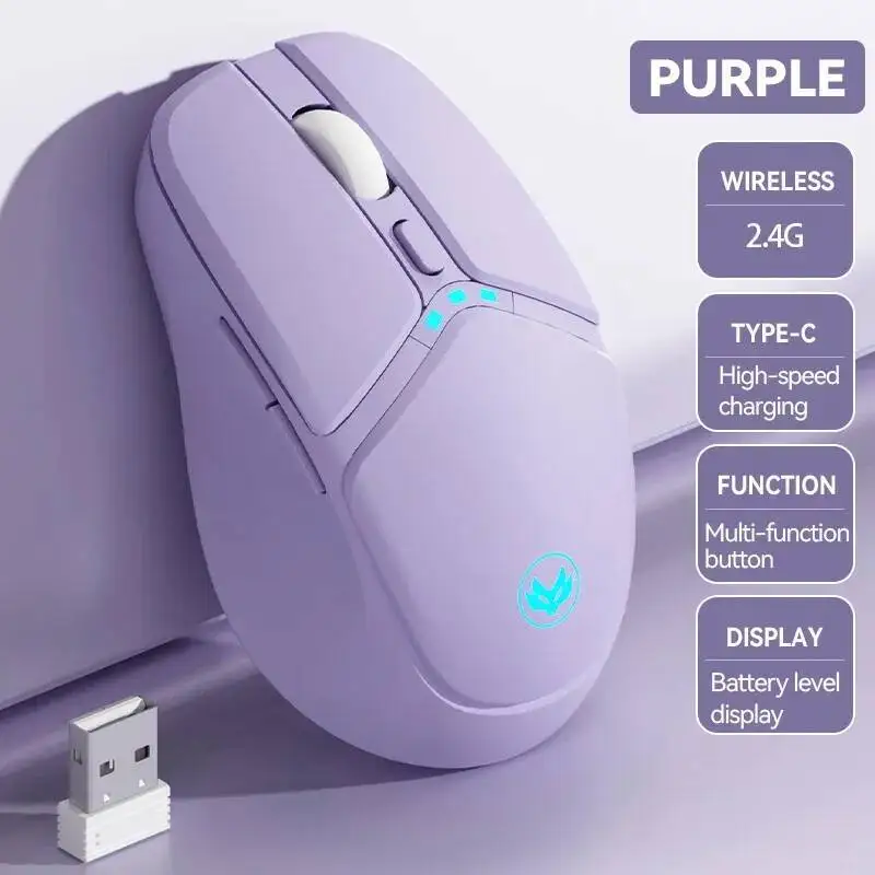 Симпатичная фиолетовая бесшумная беспроводная мышь 2,4G с индикатором заряда батареи, перезаряжаемая оптическая эргономичная компьютерная мышь для офисных игр типа C