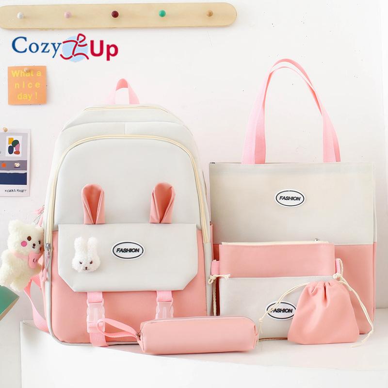 Симпатичная школьная сумка, ученики начальной и средней школы, рюкзак для отдыха большой вместимости, набор из 5 предметов, рюкзак для девочек-кроликов 44x30x14cm розовый
