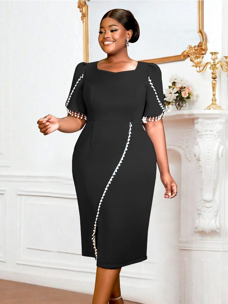 Синее вечернее платье с кисточками, квадратный вырез, короткие рукава, расшитый пэчворк, свадебное, женское платье для особого случая, весна 2025, новый стиль 3XL чёрный