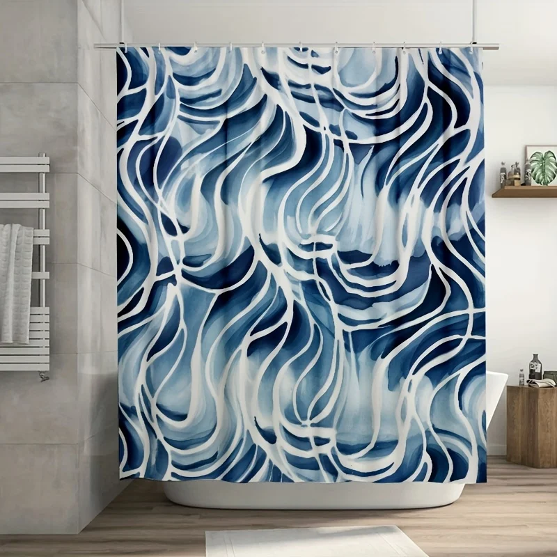 Сине-белая волнистая занавеска для душа, прочный полиэстер, легко чистится, с крючками, можно стирать в машине, декор с космической тематикой