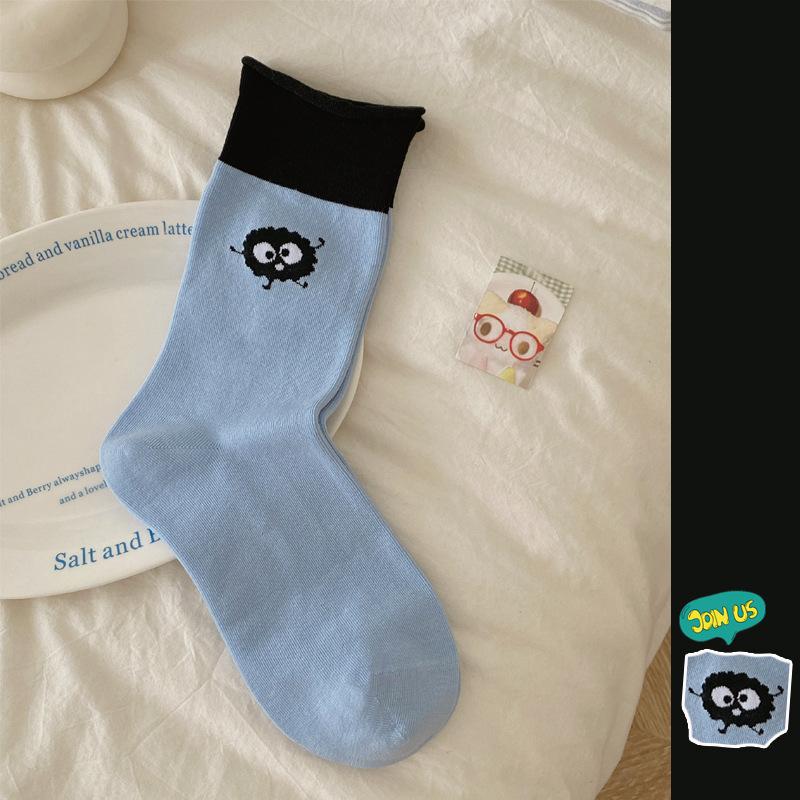 Сине-белые носки для девочек, осенние мультяшные носки до середины икры с маленьким черным угольком, цветные блочные носки с отворотами в стиле колледжа 1 pair