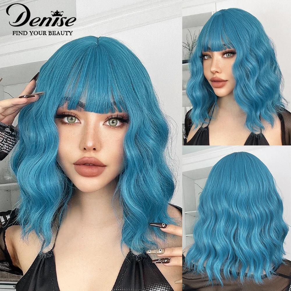 Синий короткий синтетический парик Боб для женщин с челкой волнистые Волнистые Косплей Лолита повседневные натуральные термостойкие волосы