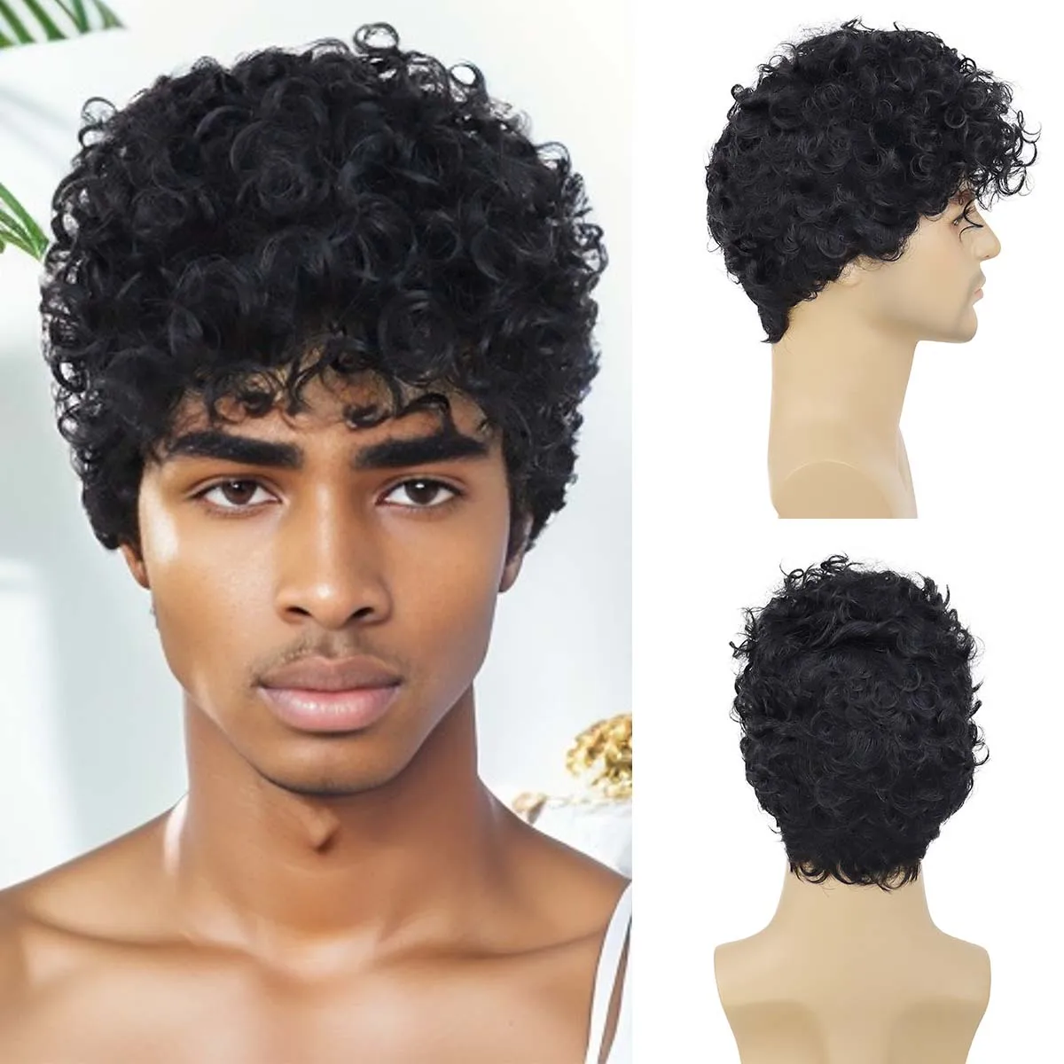 Синтетический короткий искусственный для мужчин, афроамериканский парик, вьющийся, красивый с челкой, ежедневный косплей, Хэллоуин