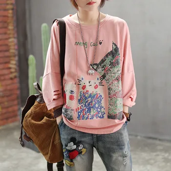 Before spring of 2019 new style short long loose languid is lazy wind hole printing nine points after sleeve T-shirt girl