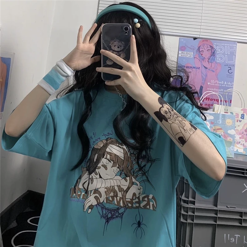 Синяя футболка в стиле E Girl, футболка в стиле Харадзюку, футболка с графическим принтом в стиле аниме 90-х, футболка Egirl для женщин, топы Y2K, эсте...