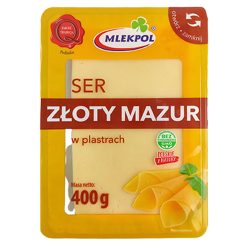 Zloty Mazur - сир з коров'ячого молока з м'яким, тонким смаком і приємним ароматом. Золотий Мазур ідеально підходить для приготування бутербродів. Цей сир доповнить і урізноманітнить меню всієї родини.
