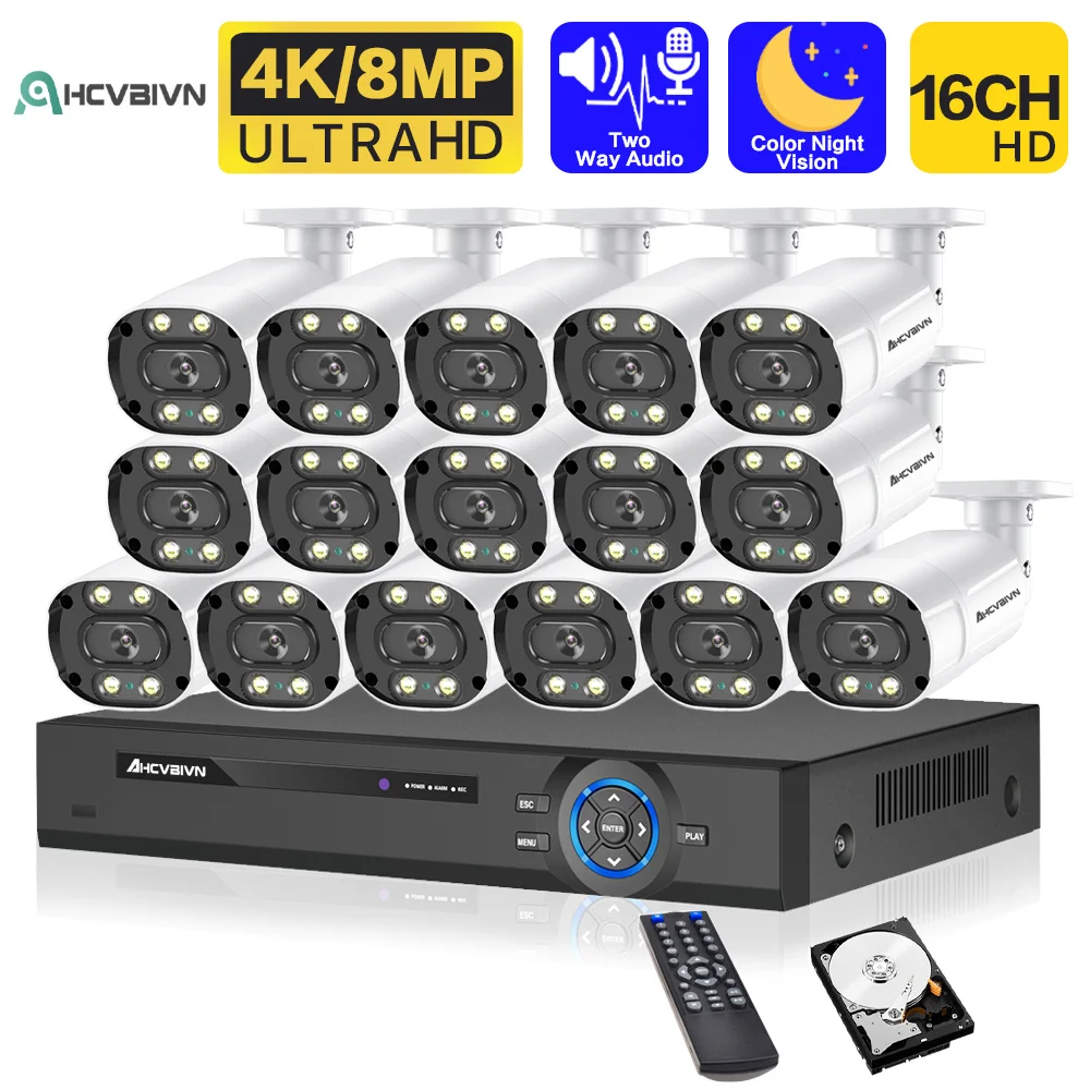 Система видеонаблюдения H.265, 16 каналов, 8 каналов, 4K POE NVR, 8 Мп, двустороннее аудио, цветное ночное видение, наружная IP-камера в комплекте