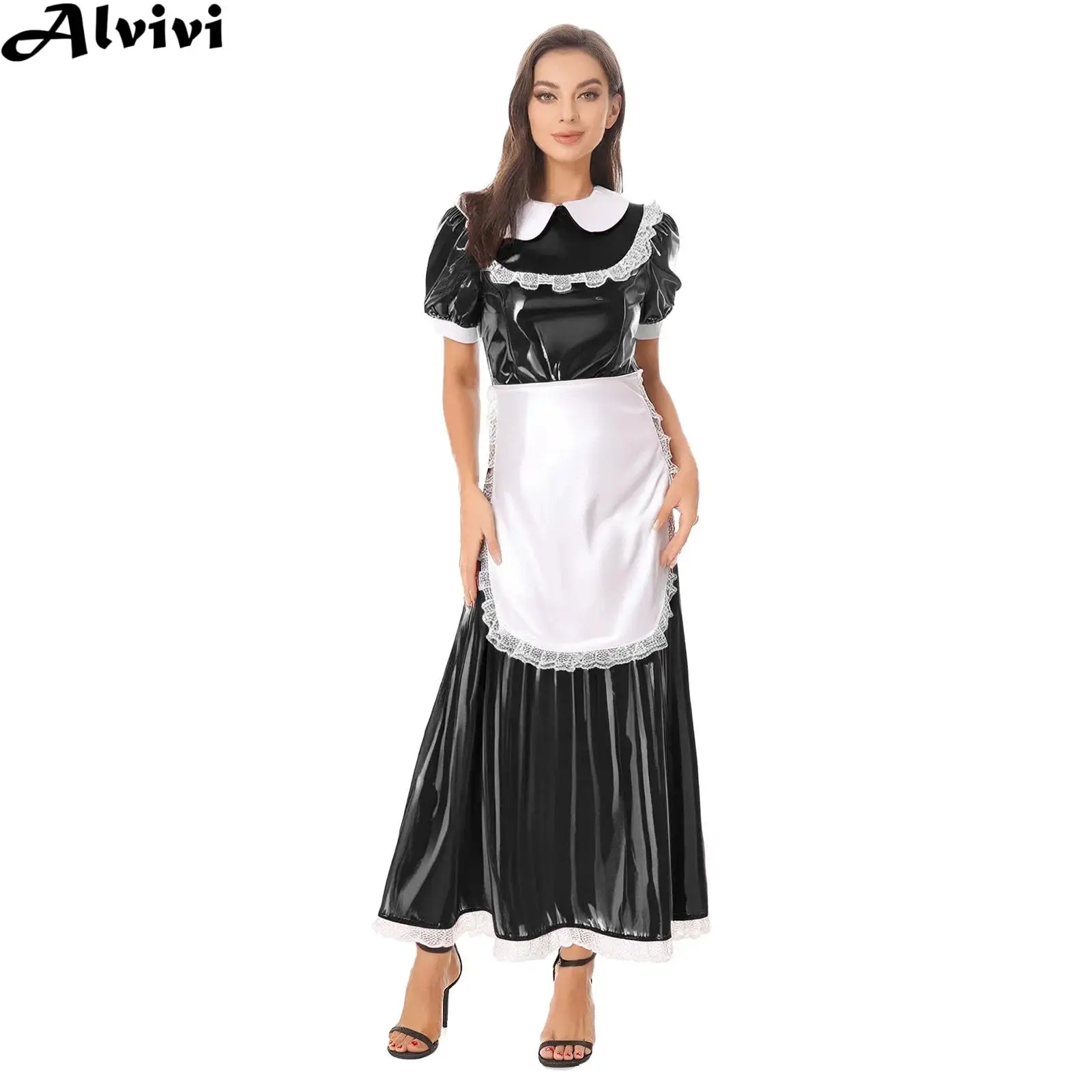 Женское платье французской горничной с коротким рукавом и мокрым эффектом из искусственной кожи с кружевной отделкой и фартуком, клубная одежда, униформа служанки, карнавальный костюм на Хэллоуин