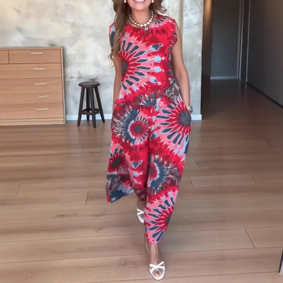 Комплект из 2 предметов, топ без рукавов с круглым вырезом и принтом, широкие брюки, летняя свободная женская одежда в этническом стиле