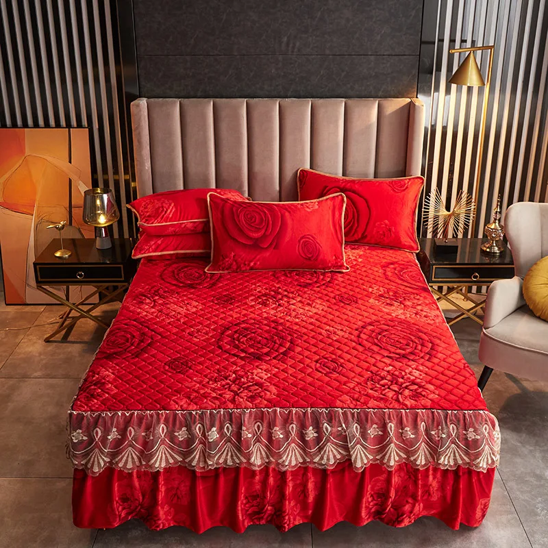 Thick Quilted Bed Skirt with Lace Cozy Velvet Euro Princess Style Single Double Bed Mattress Cover Warm Bed Cover