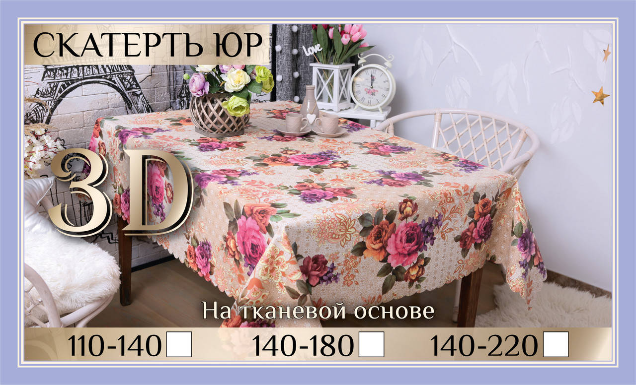 У нас в ассортименте 21 вид скатертей 3D.Что бы их посмотреть вам нужно перейти на сайт компании "Скатерть ЮР"
