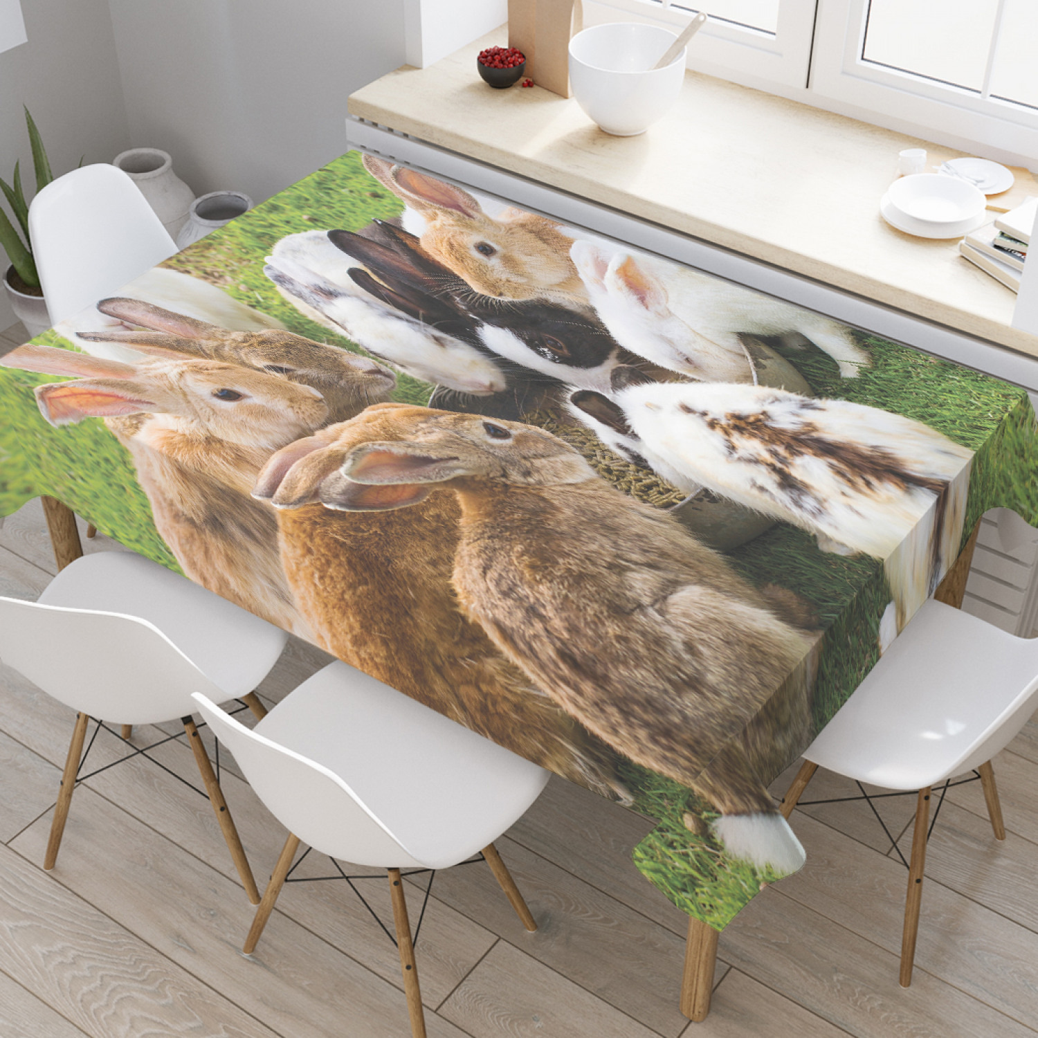 Скатерть прямоугольная на кухонный стол JoyArty "Кроличий завтрак" из оксфорда, 180x145 см, Зеленый, Кроличий завтрак