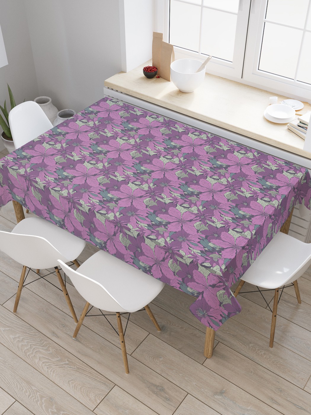Скатерть прямоугольная JoyArty "Цветочное нашествие" из сатена, 180x145 см, Фиолетовый, Цветочное нашествие