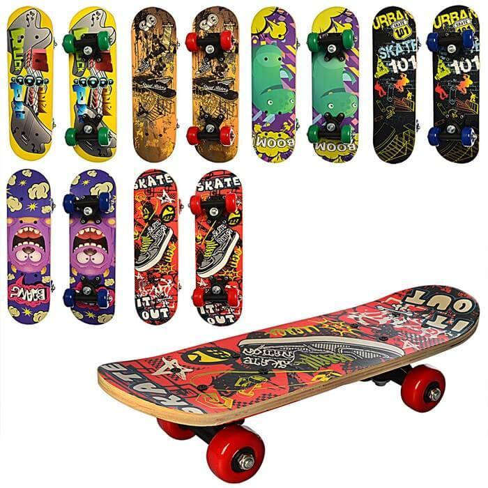 Скейт MS0324-1 (12шт) 43*13см, 6видов, рисунок двохстор., разборный, колеса ПВХ 45мм (цветные), пласт.подвеска, 7слоев (китайский клен), подш. 608Z