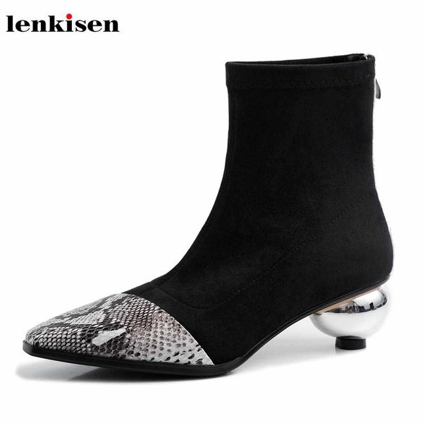 lenkisen new cow leather stretch flock med heels pointed toe mixed colors snakeskin pattern strange heels winter ankle boots l63, Black