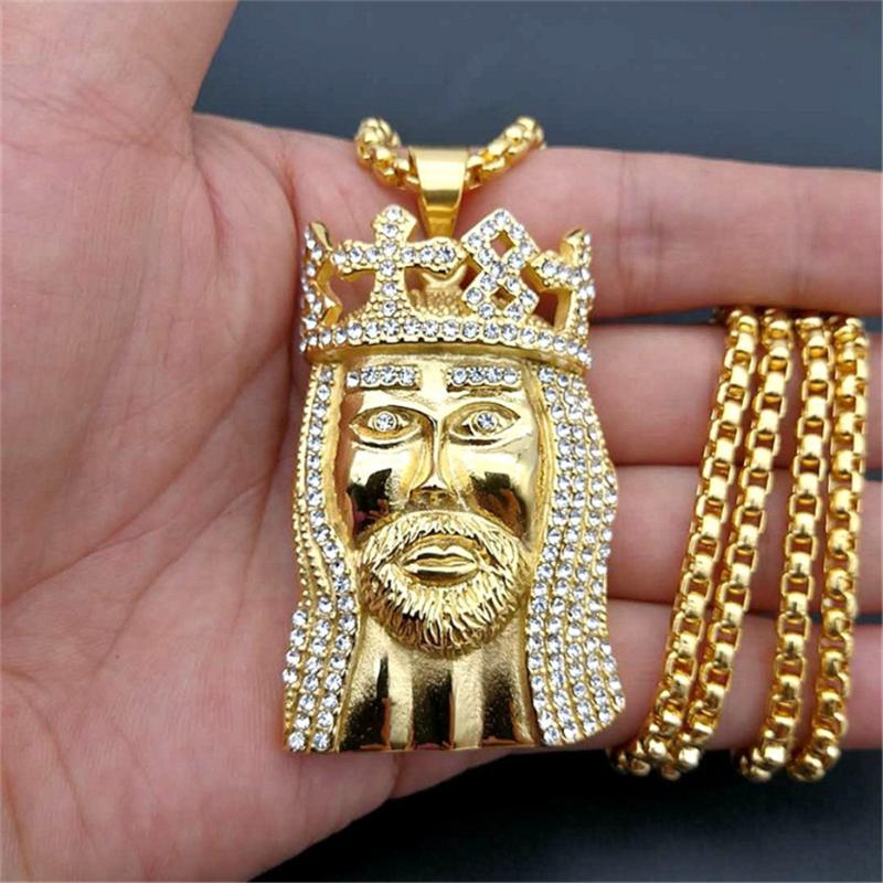 Hip Hop Big Jesus Head Iced Out Chain Pendant Necklace Gold Color Stainless Steel Rhinestones Necklace Men's Jewelry Gift