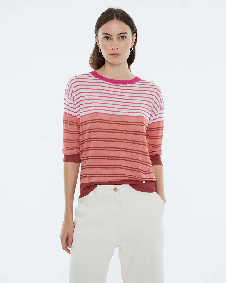 Женский свитер тонкой вязки в полоску с круглым вырезом и французскими рукавами Andam, розовый