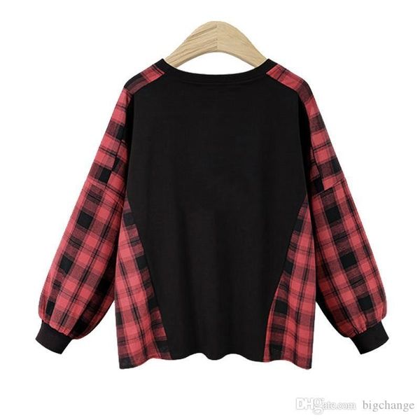 large size womens plaid print stitching bat shirt round neck long sleeved t shirt casual women, White