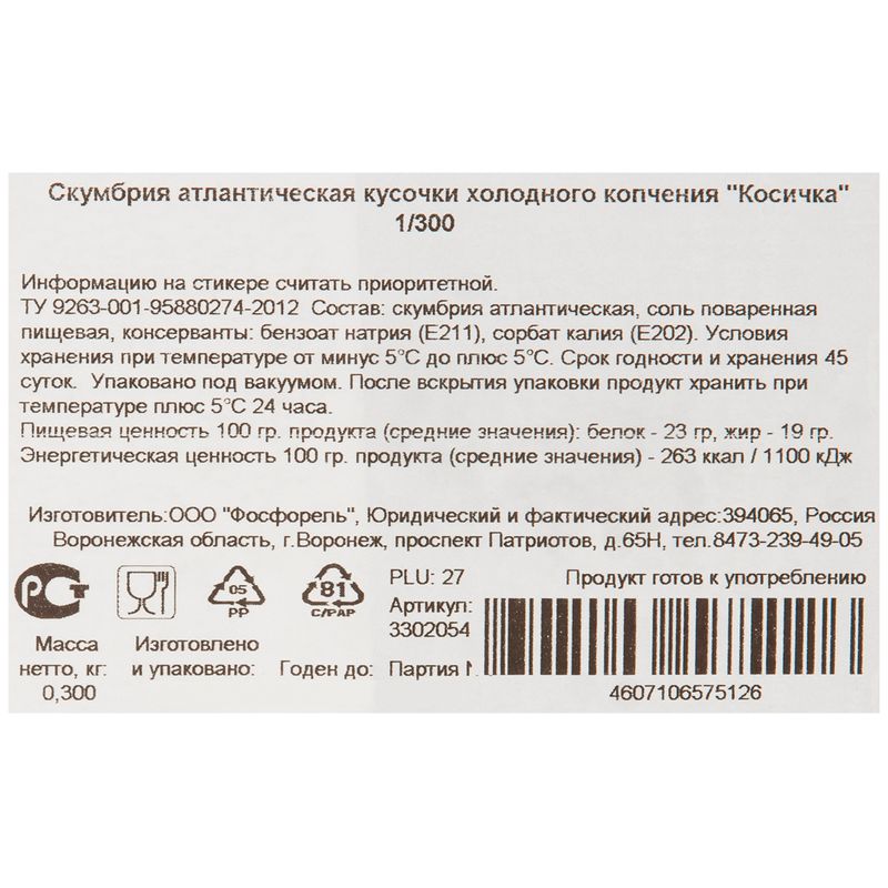 Скумбрия холодного копчения Рыбная миля Косичка, нарезка 300 г