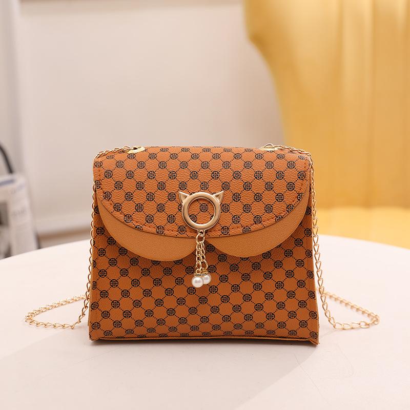 Сладкая и милая сумка-маленькая квадратная сумка с жемчужной подвеской 2025 новая женская сумка ретро с принтом маленькая сумка для мобильного телефона сумка на цепочке светло-коричневого