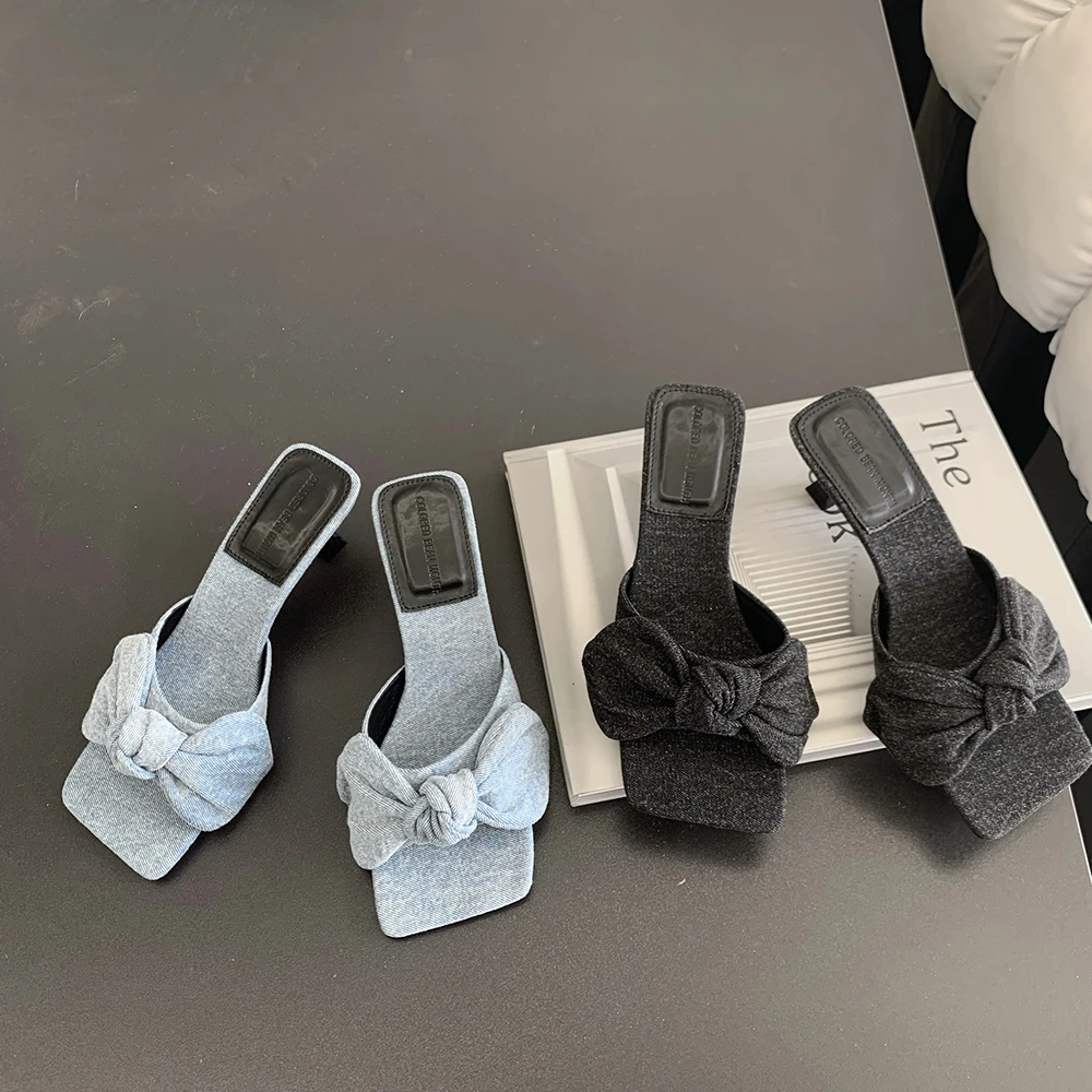 Сланцы женские джинсовые с открытым носком, тонкие высокие сандалии, классические туфли-лодочки, летняя обувь, Размеры 35-39