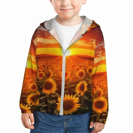 Qekee Sunset Golden Sunflower Field Print UPF 50+ Kids Sun-Protective Hooded Long Sleeve Rash Guard for Fishing Water Beach Sports -2 Years