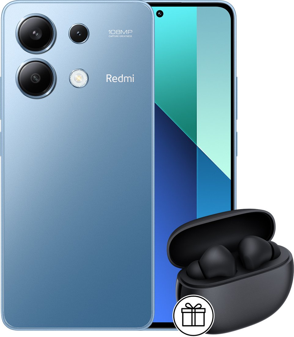 Телефон Xiaomi Redmi Note 13 8GB/128GB с NFC международная версия (ледяной синий) и Xiaomi Redmi Buds 4 Active (черный) по акции