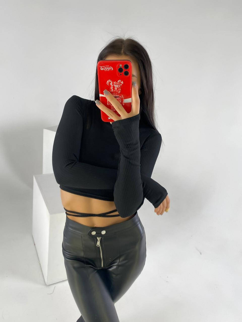 Женская кофта топик рубчик чёрный с рукавами трикотаж рубчик|Укороченая кофта для девушек завязки на животе, Черный