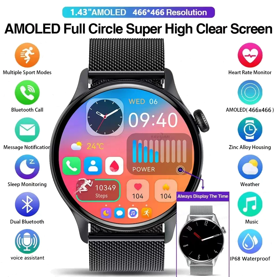 Смарт-часы AMOLED для мужчин, 2023, 466*466, 1,43 дюйма, HD-экран, всегда отображать время, NFC, Bluetooth, водонепроницаемые умные часы для женщин
