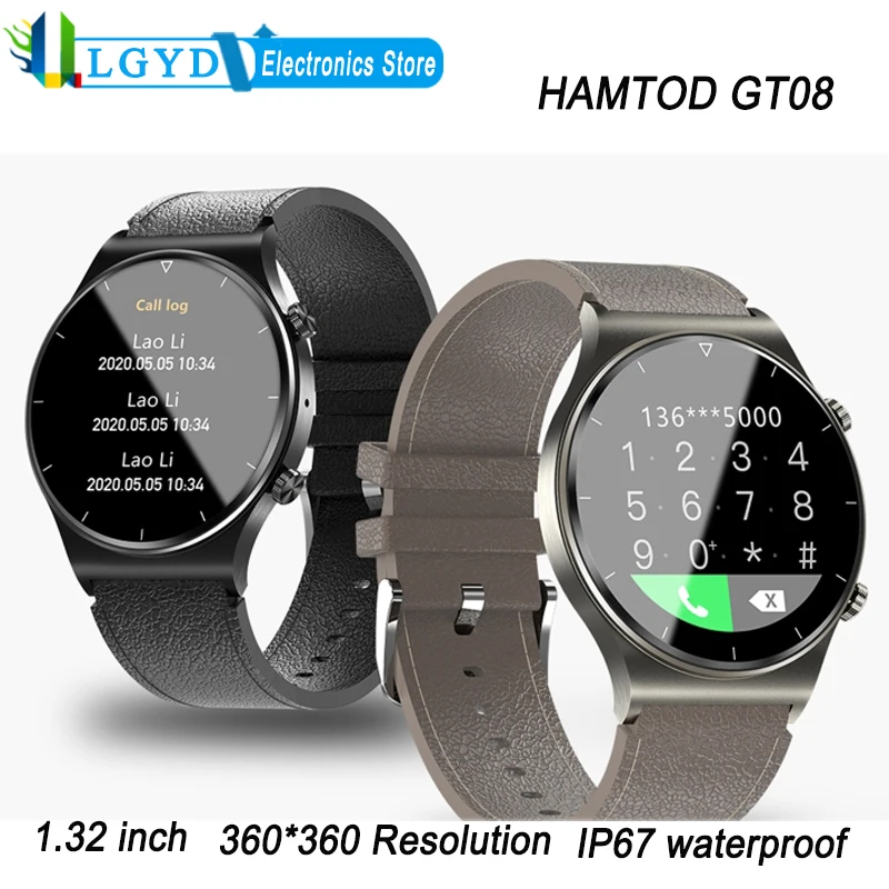 Смарт-часы HAMTOD GT08 с TFT-экраном 1,32 дюйма, водостойкие, IP67, аккумулятор 200 мАч, разрешение 360*360, кожаный ремешок с оправой из цинкового сплава