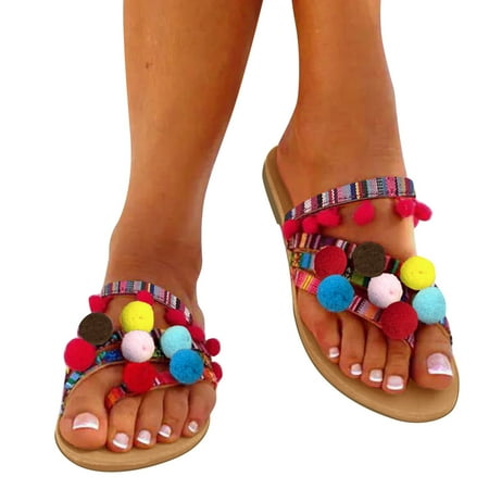 A1 new home gifts for home Ladies Fashion Summer Colorful Cloth Plush Ball Decor Boho Flat Sandals Cloth Red
