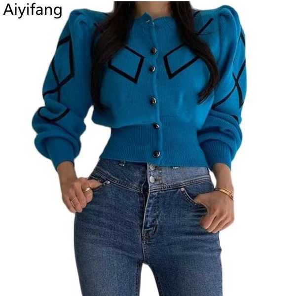 women's knits & tees 2021 autumn winter womens puff long sleeve short sweater vintage fashion jacquard knitwear single-breasted knitted, White