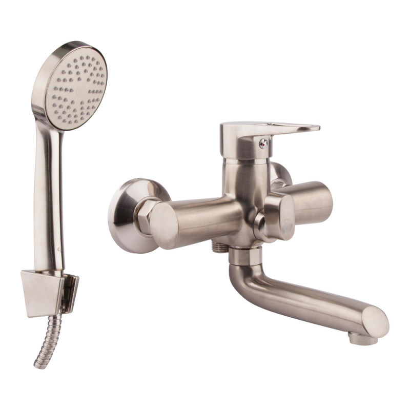 Смеситель для ванны GF (NKS)/S-02-005BN выполнен из качественного материала с держателем ручного душа, душевым шлангом и лейкой. Для включения потока воды предусмотрено удобный рычаг с отверстием и нанесенной маркировкой Х+Г воды, для переключения на душ - поворотный дивертор в виде рычага. Настенный монтаж осуществляется с помощью крепежных деталей, которые входят в комплект. Круглые розетки скроют все погрешности установки.