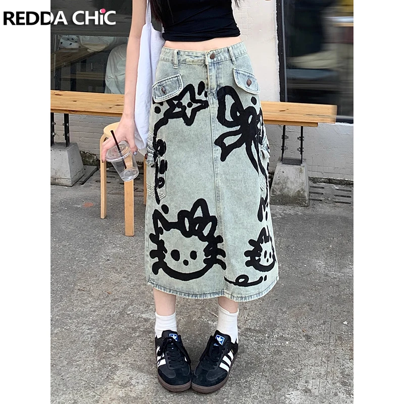 ReddaChic Cartton Graffiti Denim Cargo Skirt Distressed Retro Low Waist Straight Split Midi Long Jean Skirt Y2k Women Streetwear